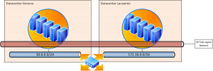 Lorsqu’une VM est déployé sur le réseau logique de production à Genève, elle utilisera la configuration réseau physique de Genève automatiquement. Si on déploie une machine sur le réseau logique de production à Lausanne, elle utilisera le réseau physique de Lausanne automatiquement: