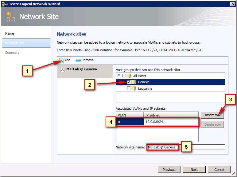 - Cliquez sur Add pour ajouter un nouveau Network Site. Un Network Site représente le réseau physique attaché à un groupe d’hôtes. Ici nous allons créer le Network Site attaché aux hôtes de Genève.