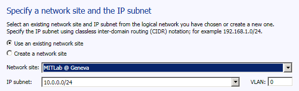 $logicalNetwork = New-SCLogicalNetwork -Name "<strong>MITLab Logical Network</strong>" $allHostGroups = @() $allHostGroups += Get-SCVMHostGroup -ID "<strong>4e334768-7f05-465d-aa55-9d5a05ab884f</strong>" $allSubnetVlan = @() $allSubnetVlan += New-SCSubnetVLan -Subnet "<strong>10.0.0.0/24</strong>" -VLanID <strong>0</strong> New-SCLogicalNetworkDefinition -Name "<strong>MITLab @ Geneva</strong>" -LogicalNetwork $logicalNetwork -VMHostGroup $allHostGroups -SubnetVLan $allSubnetVlan -RunAsynchronously $allHostGroups = @() $allHostGroups += Get-SCVMHostGroup -ID "<strong>dd6434f3-8789-4bfa-a9b3-f4b08fe4cce2</strong>" $allSubnetVlan = @() $allSubnetVlan += New-SCSubnetVLan -Subnet "<strong>172.16.0.0/16</strong>" -VLanID <strong>0</strong> New-SCLogicalNetworkDefinition -Name "<strong>MITLab @ Lausanne</strong>" -LogicalNetwork $logicalNetwork -VMHostGroup $allHostGroups -SubnetVLan $allSubnetVlan -RunAsynchronously |