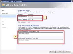 - Si vous souhaitez réserver des adresses à d’autres fins (éléments réseau, DNS, DC…), vous pouvez réserver ces adresses dans le cadre IP addresses to be reserved for other uses. Si vous souhaitez par la suite utiliser un Appliance de load-balancing (Netscaler…Article à venir), vous pouvez réserver les adresses IP virtuelles pour les serveurs load-balancés.