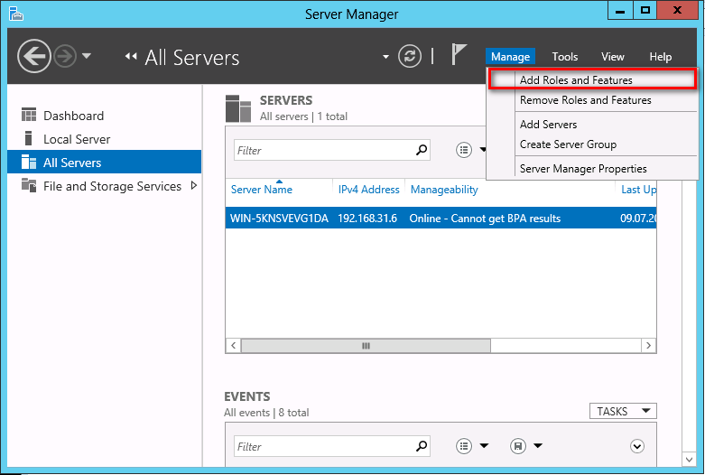 2. Dans le menu Manage, sélectionnez Add Role and Features.