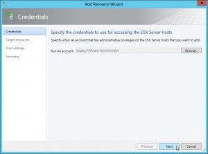 Avant de commencer, prenez bien soin de créer un Run as account dans VMM avec un compte qui a le rôle Administrator au niveau du vCenter Server.
