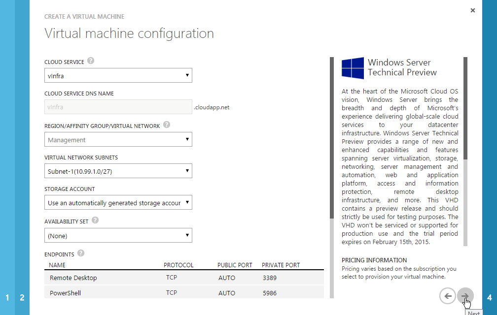 Ensuite sélectionnez le cloud service si vous en avez un, sinon créez en un. Vous ne pouvez pas avoir de VM sans cloud service. Comme nous somme sur du test, pas besoin d’Availability Set. Configurez également les ports RDP et Powershell vous permettant d’y accéder à distance. Evitez autant que faire se peu d’utiliser le port par défaut 3389, ou laissez sur AUTO. Puis cliquez sur Next.